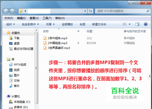 将要合并的多首MP3复制到一个文件夹里,按你想要播放的顺序进行排序(可将这些MP3进行重命名,在前面加数字1、2、3等等,再按名称排序)