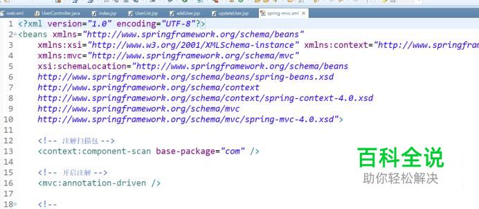 在spring-mvc.xml文件中开启注解方式和设置扫描路径。代码如下图。