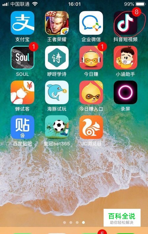 第一步,打开我们的手机,进入主页面找到抖音app。(红标框选处)