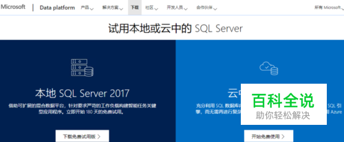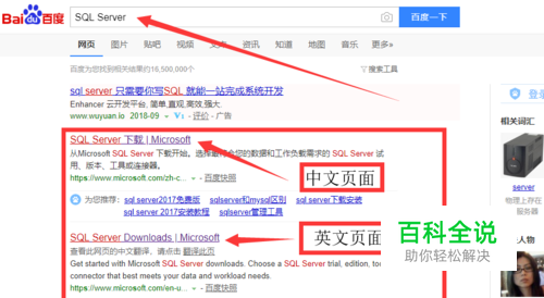 打开浏览器,在浏览的搜索框中我们输入“SQL Server”。如图,会匹配出中文两条微软官方下载页面(一个页面内容是英文、一个页面内容是中文)。这里我们以中文的为例。