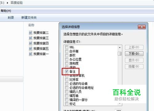 按自己所想的排列顺序修改文件的备注数值。 方法一:右键单击文件选择属性,在属性的对话框里查看“详细信息”,找到备注,在后面输入数值,按确认。比如我想让这个文件排第一,我就输入数字1。(上图) 方法二:左键单击文件,在文件夹下方会显示文件的属性,找到备注,在后面输入数值,按回车确认。(下图)