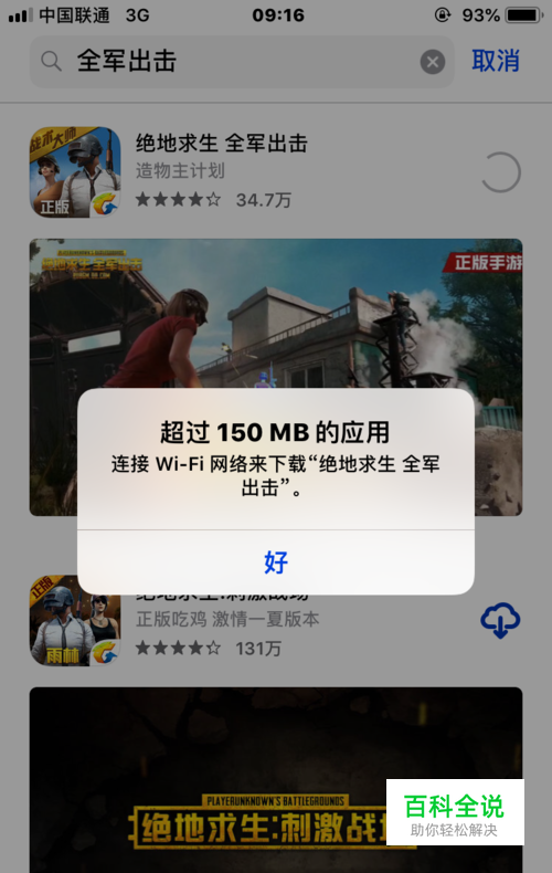 首先,在app store找到你需要下载的大于150M的软件,这里我以下载吃鸡为例,点击“好”。