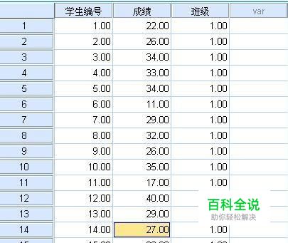 spss中如果要给原始的分数加上相应的分数需要使用compute,我们看一个例子,下面是不同的班级的不同的分数,因为某些原因,我们要给1班的学生的分数加上三分,给二班的学生分数加上两分,这该怎么做呢?下面是具体的方法。