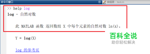 第二步我们可以在matlab命令行窗口中输入“help log”,可以看到关于log函数的介绍,以e为底的对数函数,如下图所示: