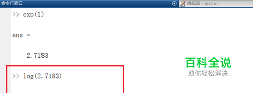 第三步在命令行窗口中输入exp(1),表示e,e大约为2.7183,再输入log(2.7183),如下图所示: