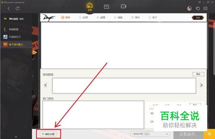 使用WEGAME成功登录DNF游戏后,点击WEGAME中DNF专区左下方的“辅助设置”选项。