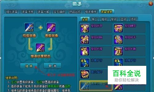 装备继承规则 1、右边放置的高级装备不能低于左边低级装备的使用等级或者品质。 2、继承后的装备继承高级装备的基础属性,继承低级装备强化等级、洗炼属性,继承后孔数会变为0(镶嵌宝石请先提前摘除) 3、高等级的装备继承低等级装备后强化等级降低1 4、使用保护符可以保护强化等级不降低