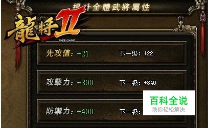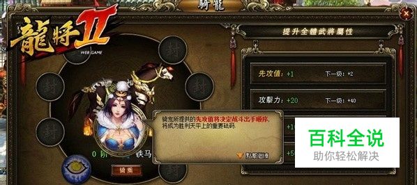 骑宠系统 当玩家等级达到二十级左右时,《龙将2》中就将开启骑宠系统,玩家点亮24级的龙珠可以获得骑宠铁马,而在之后的骑宠培养中,骑宠的转生也将受到龙珠系统,也即是玩家等级的影响,玩家必须达到一定的级别并点亮相应龙珠才能够转生骑宠,如玩家要将铁马转生为天狼,需要点亮40级龙珠。 骑宠属性提升 《龙将2》中的骑宠将为玩家提供各种战力属性加成,包括先攻值、攻击力、防御力、生命值四个方面,其中最重要的是先攻值,因为它影响的是玩家武将的出手速度,在一场战斗中,先攻值高的一方将优先出手。而先攻值的提升,只能从玩家的等级龙珠以及骑宠培养中获得。 骑宠培养 《龙将2》骑宠培养总共有三种方式,普通培养、金砖培养与高级培养。普通培养消耗银两,每次培养获得的经验较少,有几率出现小暴击;金砖培养消耗金砖,每次培养获得的经验比银两多很多,有几率出现小暴击和大暴击;高级培养是一键培养的简洁方式,一键进行50次金砖培养,让骑宠星级得到迅速提升。金砖培养与高级培养都会优先消耗道具神马鞭。