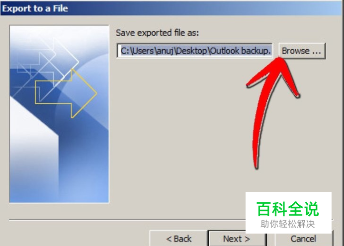 决定保存位置。点击浏览按钮,来确认保存位置。给文件取一个描述性的名字,选择下一步。