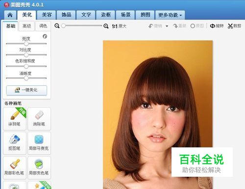 首先我们要打开美图秀秀软件,然后点击上访的美化按钮,之后你就可以看到如下的选项,每个选项可以处理一个方面的内容。下面就分步骤给大家介绍一下。