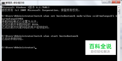 以管理员省份运行命令提示符,输入: netsh wlan set hostednetwork mode=allowssid=mofangwifi key=mofang123456 其中,ssid是wifi的名字,要用英文的。Key是wifi密码。