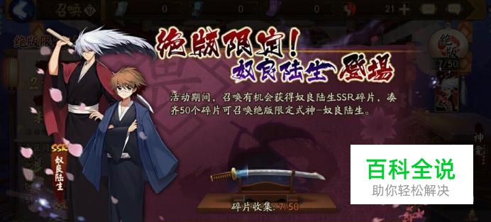 抽卡 在活动期间阴阳师等级在十五级以上的玩家可以抽卡,有概率掉落奴良陆生碎片