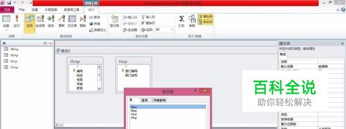 拖动“tGrp”表中的“部门编号”字段到“tEmp”表中的“所属部门”字段上,建立两表间的联系,关闭【显示表】对话框。