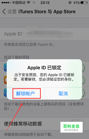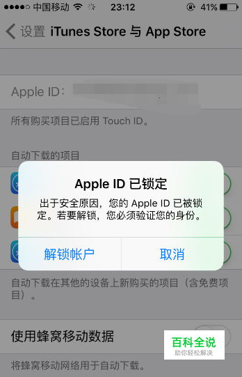 当我们进入苹果手机的“iTunes Store与App Store”页面时,点击自己的Apple ID,如果Apple ID被锁定,在手机页面中就会弹出“Apple ID已锁定”的对话框,要想解锁我们点击对话框左下角的“解锁帐户”按键。
