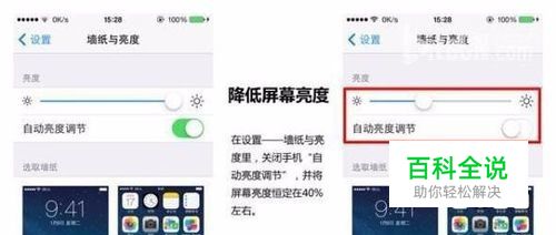 方法:在设置——墙纸与亮度里,关闭手机“自动亮度调节”,并将屏幕亮度恒定在40%左右。既可以满足绝大多数的使用情况,最主要是能够明显控制iPhone掉电速度。