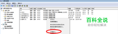 进入管理之后,我们选择“磁盘管理”,查看电脑分区情况。看看是否有空闲的主分区,如果有。我们直接右键点击C盘,然后选择“扩展卷”。
