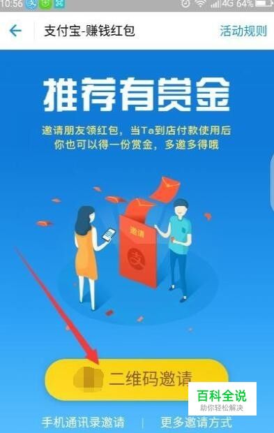 第一,首先让朋友在手机打开支付宝的首页,点击如图所示“支付宝发红包”,再点击“二维码邀请”,出现一个二维码页面。