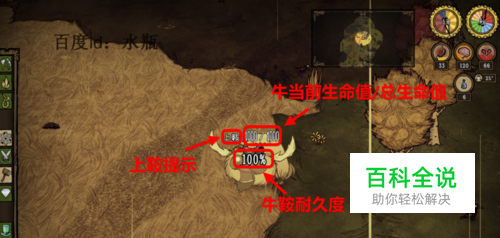 这时候再把牛鞍放在牛身上,会出现“上鞍”字样,并出现100%(指的是这副牛鞍的耐久度)。几个数值小编都在下图中标注出来,看下图。