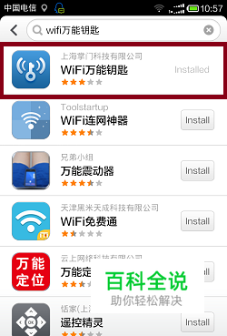 首先,如果还没有安装wifi万能钥匙,请打开任意一款安卓市场应用,搜索下载并安装wifi万能钥匙。如果已经安装wifi万能钥匙,请升级至最新版,以免出现因新旧版本布局不同,而不能成功的情况。