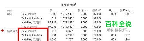 我们先来分析多变量检验,如图所示的红色方框中显示的是检验的不同方法,有时候不同的方法会显示出不同的结果,你要分别解释,下面的结果是一致的