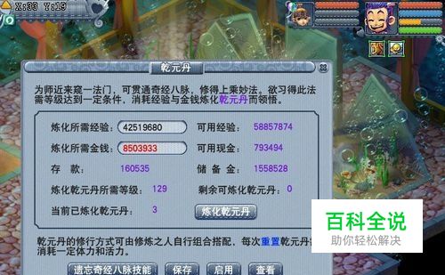 首先回到师门,点击师傅,里边有一条是乾元丹学习,点击它以后,进入乾元丹学习界面。学习了乾元丹,每个乾元丹可以增加一级奇经八脉等级。学习乾元丹需要花费一定的经验与金钱,金钱以储备金为先。