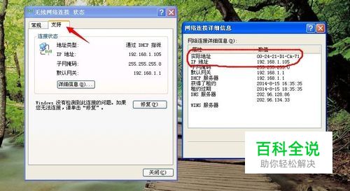 右键点击电脑桌面右下角的无线连接图标,然后左键单击状态,在弹出的无线连接对话框中选择—支持,然后点击详细信息,这里可以看到我们电脑的实际地址和当前IP地址。