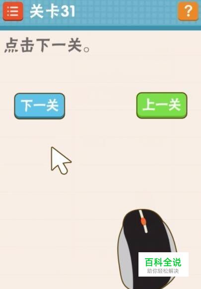 关卡31:点击下一关。移动鼠标,将鼠标箭头对牢下一关,然后点击鼠标左键即可过关。