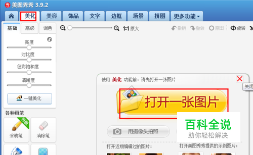 首先打开“美图秀秀”,切换至“美化”选项卡,然后点击“打开一张图片”按钮。