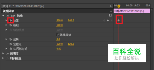 单击“位置”前方的图标按钮,此时就完成了一个关键帧的设置。如果要调整该关键帧的位置,可以选中它,然后拖动。