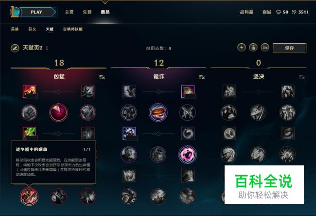 首先我们来看看女警的天赋加点; 加点采用18-12-0加点方式,直接点出“战争领主的嗜血”,后期的高攻速可以最大化嗜血的吸血效果,团战中不会因为缺少续航而遭到击杀;(具体如图)