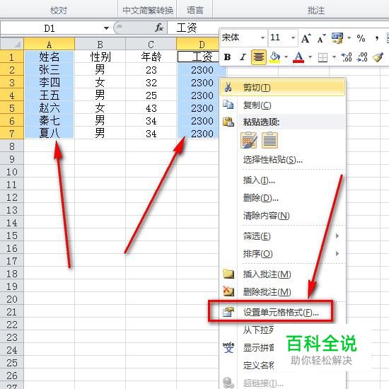 首先,选中A列和D列(可以按住Ctrl键分隔选中多列),然后单击鼠标右键,选择“设置单元格格式”。