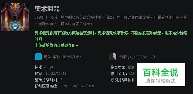 奥术诅咒是在指定区域内施放一个技能,被诅咒的敌方英雄单位受到持续伤害并降低移动速度。