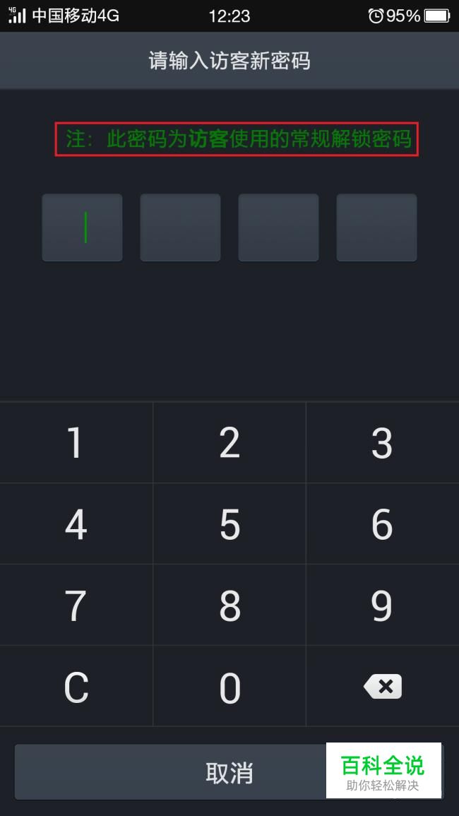 输入当前的密码后,接着就会要求你输入访客使用的密码或图案,这是访客使用的密码,一定要与你当前的密码或图案不相同才行。