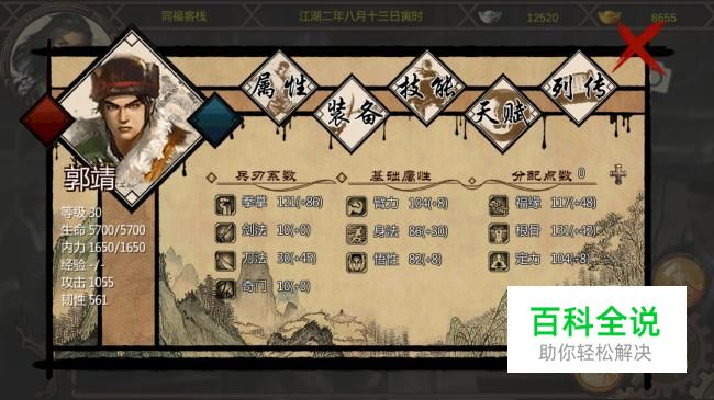 郭靖入队的时候属性和武功可是相当菜的,30点的悟性,就一门基础的南山刀法和基本内功,简直不忍直视。