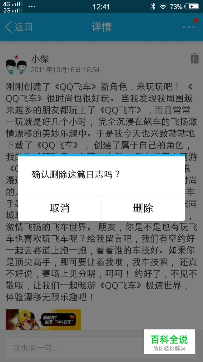 而每一条日志右上角有一个删除的选项,选择删除,就会弹出一个删除日志的窗口,点击确定就可以删除掉这条日志了。