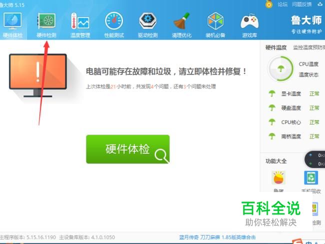 鲁大师有很多功能,有硬件体检,硬件检测,温度管理等等,我们选择硬件检测,先对我们的电脑进行一次检测,之后就可以在电脑概览里找到显示器的信息。