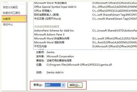 2.在弹出的“Word选项”对话框中,单击“加载项”选项卡,在“管理”的列表框中选择“模板”选项,然后单击“转到”按钮。