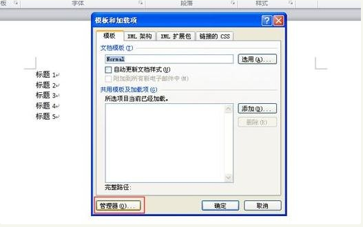 3.在弹出的“模板和加载项”对话框中,选择“模板”选项卡,单击“管理器”按钮。