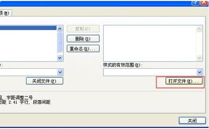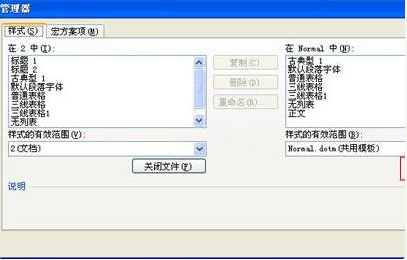 7.回到“管理器”对话框中,在“在1中”的列表框中选择需要复制的文本格式,单击“复制”按钮即可将所选格式复制到文档“2.docx"中。最后单击“关闭”按钮即可。