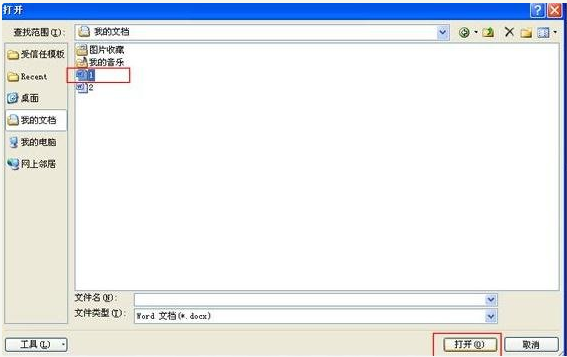6.在弹出的“打开”对话框中,首先在“文件类型”的列表框中选择“Word文档(*.docx)”选项,然后选择要打开的文件,这里选择文档“1.docx”,最后单击“打开”按钮。