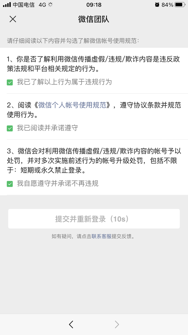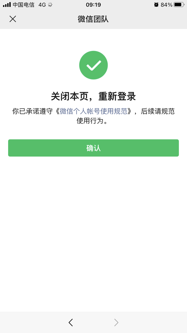 主要是让你承诺遵守《微信个人账号使用规范》,还不忘提醒你一下,请规范使用行为?是不是很懵逼,估计99%的人都不会看这个《规范》是什么内容,所以赶紧点确定吧。