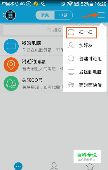 手机上打开任一有扫码功能的软件,这里小编用QQ为例。 打开QQ后,点击右上角的菜单,选择 扫一扫