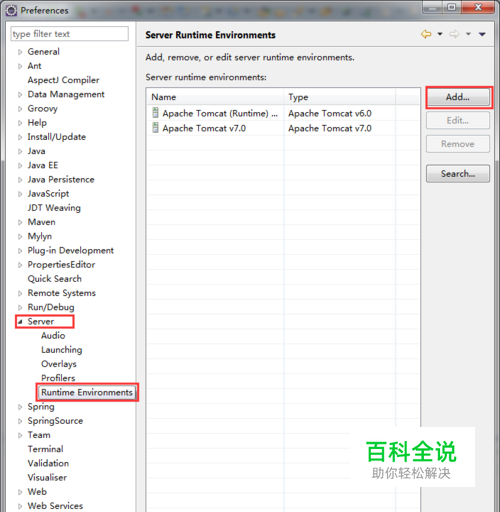 在Preference 左侧栏目中点击“Server“->”Runtime Environments“ 中的Add按钮
