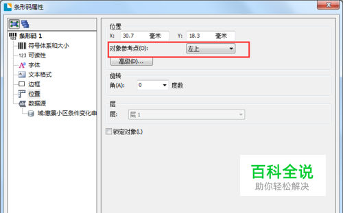 2、双击创建的条码对象,将打开的条码属性对话框切换至“位置”选项卡。可以看到默认的对象参考点是左上。即当数据变长时,条码长度会向右延伸。