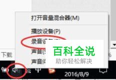 在电脑右下角找到声音图标,右击,选择录音设备。