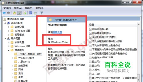 在"开始"菜单和任务栏项的右侧,就可找到关闭任务栏缩略图的策略设置了,