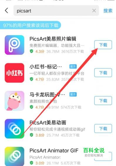 进入之后,搜索“picsart”,将图示软件下载并安装。