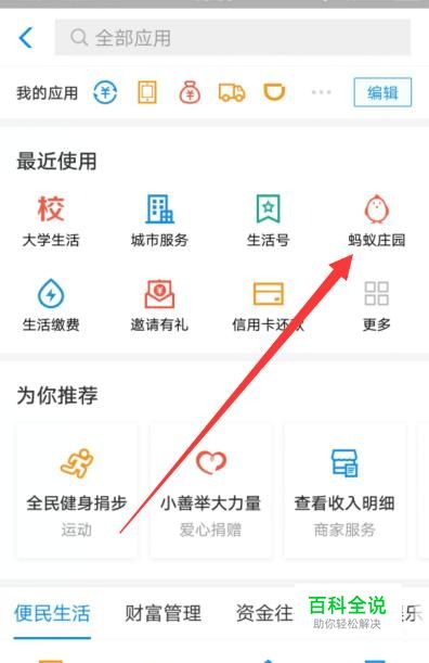 进入之后,选择“蚂蚁庄园”,进入下一页面,如图所示。