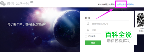 点击”微信公众平台“进入如下页面,我们在右上方找到”立即注册“ 的信息,如下图所示。