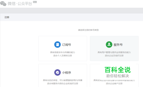 点击立即注册,我们可以看到注册的账号类型有4种,大家在这里根据自己的需要注册。夏夏在这里就注册订阅号,以”订阅号“为例给大家讲解。